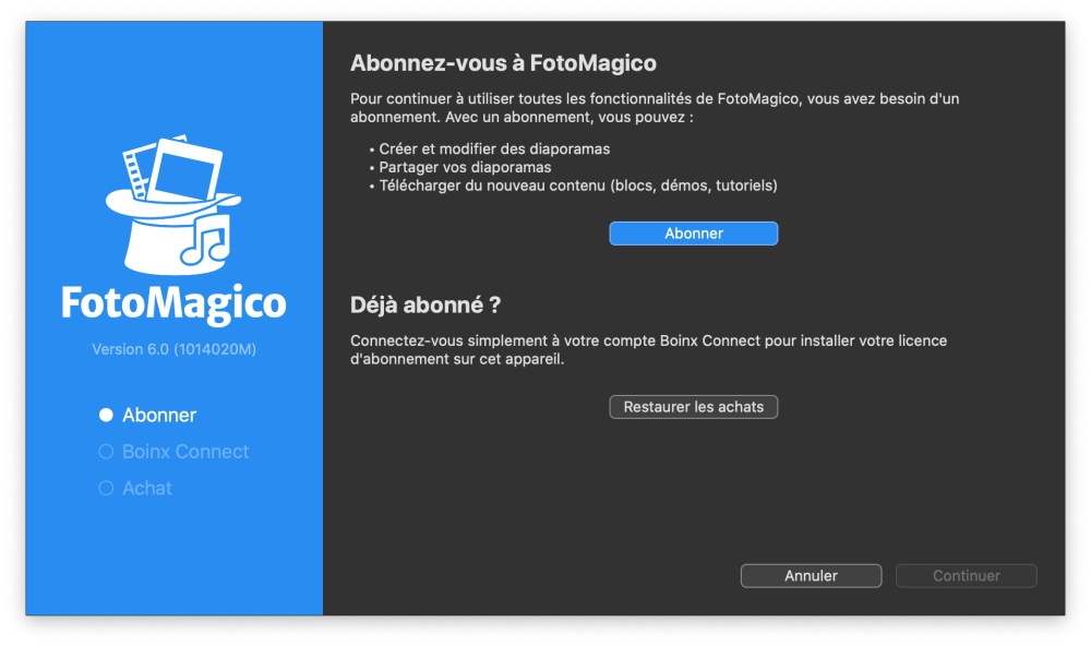 Si vous ne disposez pas encore d’une licence d’abonnement, cet assistant vous guide tout au long du processus d’achat. Ce processus peut varier selon que vous avez téléchargé FotoMagico à partir de l’App Store ou directement sur le site Internet Boinx.
